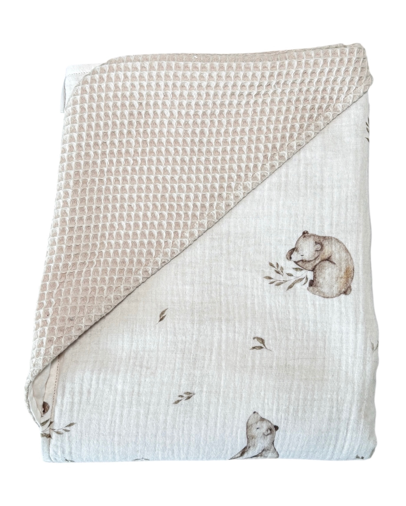 Door de combinatie van wafelstof en hydrofiel droogt de badcape heel snel na gebruik. Hang de mix & match badcape na het badje uit om te drogen, zodat je hem de volgende wasbeurt weer lekker kunt gebruiken!